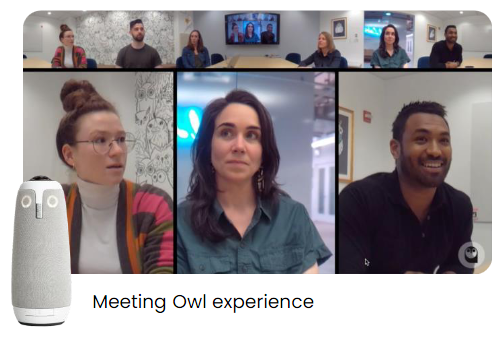 - Meeting Owl 3 + Owl Bar + Expansion Mic 360° hybrid participation for large groups